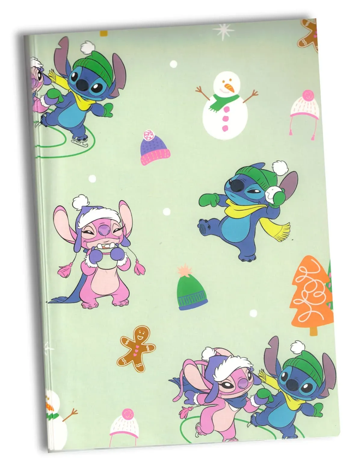 Papel decorativo verde claro con Stitch y Angela en versión invernal, ideal para envolver obsequios con un estilo divertido y festivo.
