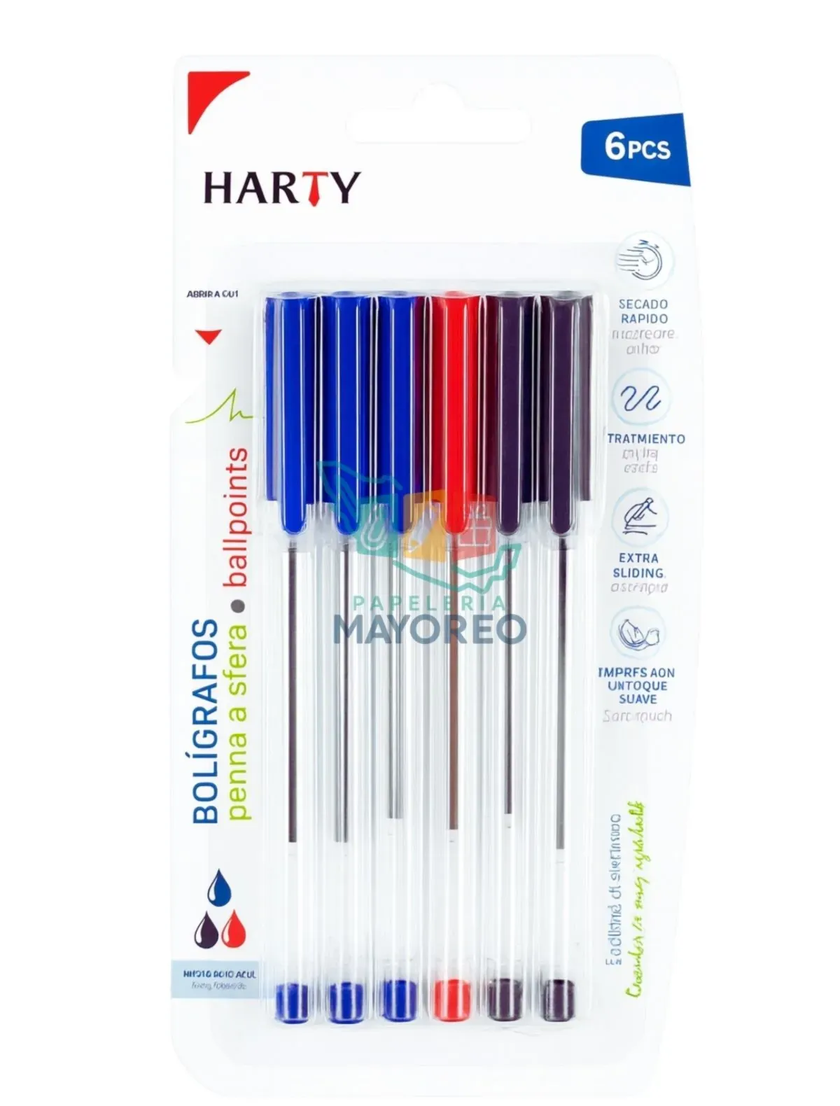 Bolígrafos Harty 6 Piezas – Azul, Rojo y Negro | Papelería Mayoreo