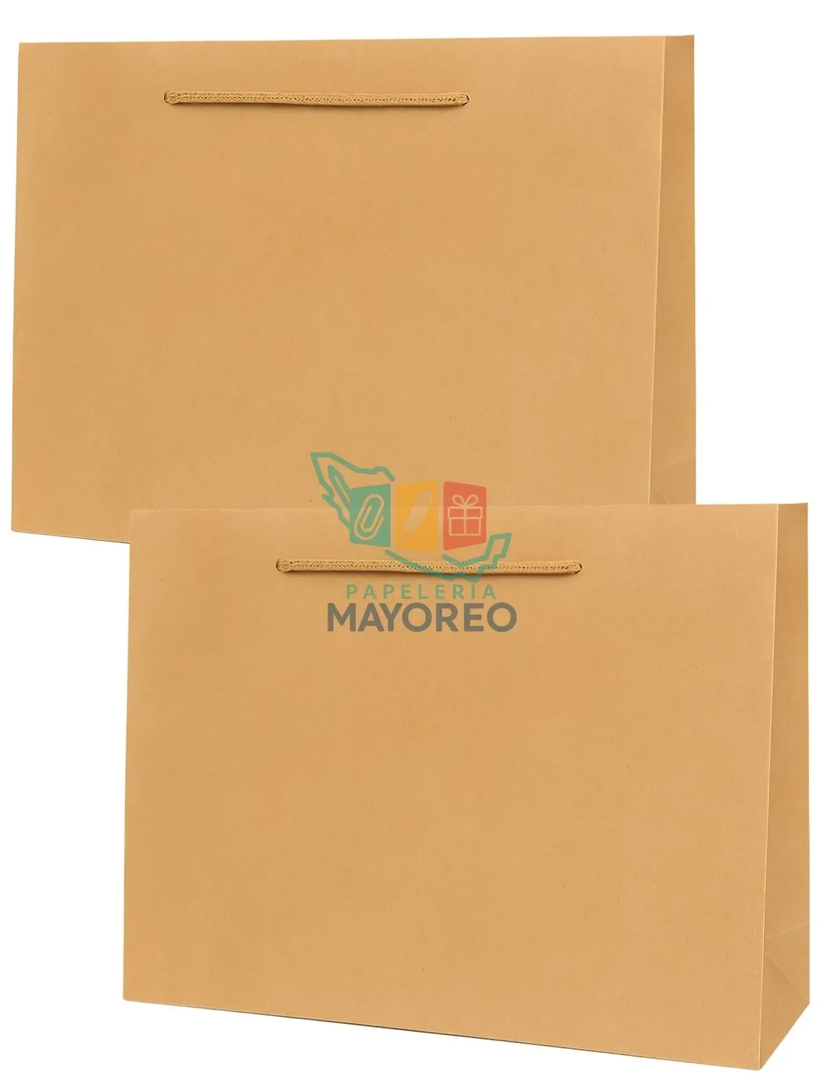 Bolsa kraft ecológica con asas, medida 50x38 cm. Ideal para regalos, papelerías y tiendas. Resistente, práctica y económica. Venta al mayoreo con envío en todo México.