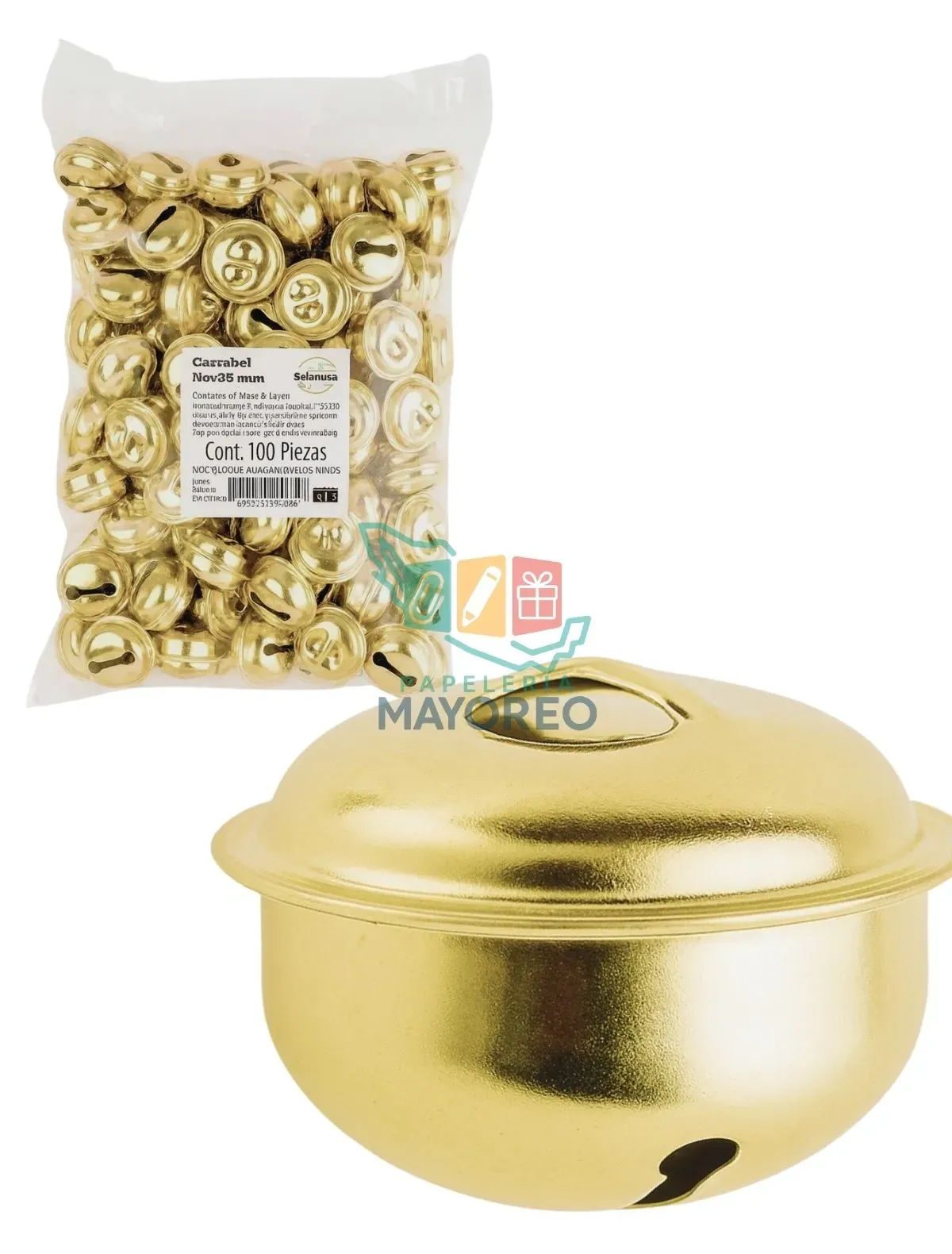 Compra al mayoreo cascabeles metálicos dorados de 24 mm, perfectos para manualidades, decoración, disfraces, piñatas, collares, pulseras y adornos navideños. Cada bolsa contiene 100 cascabeles Selanusa de alta calidad, con sonido c...