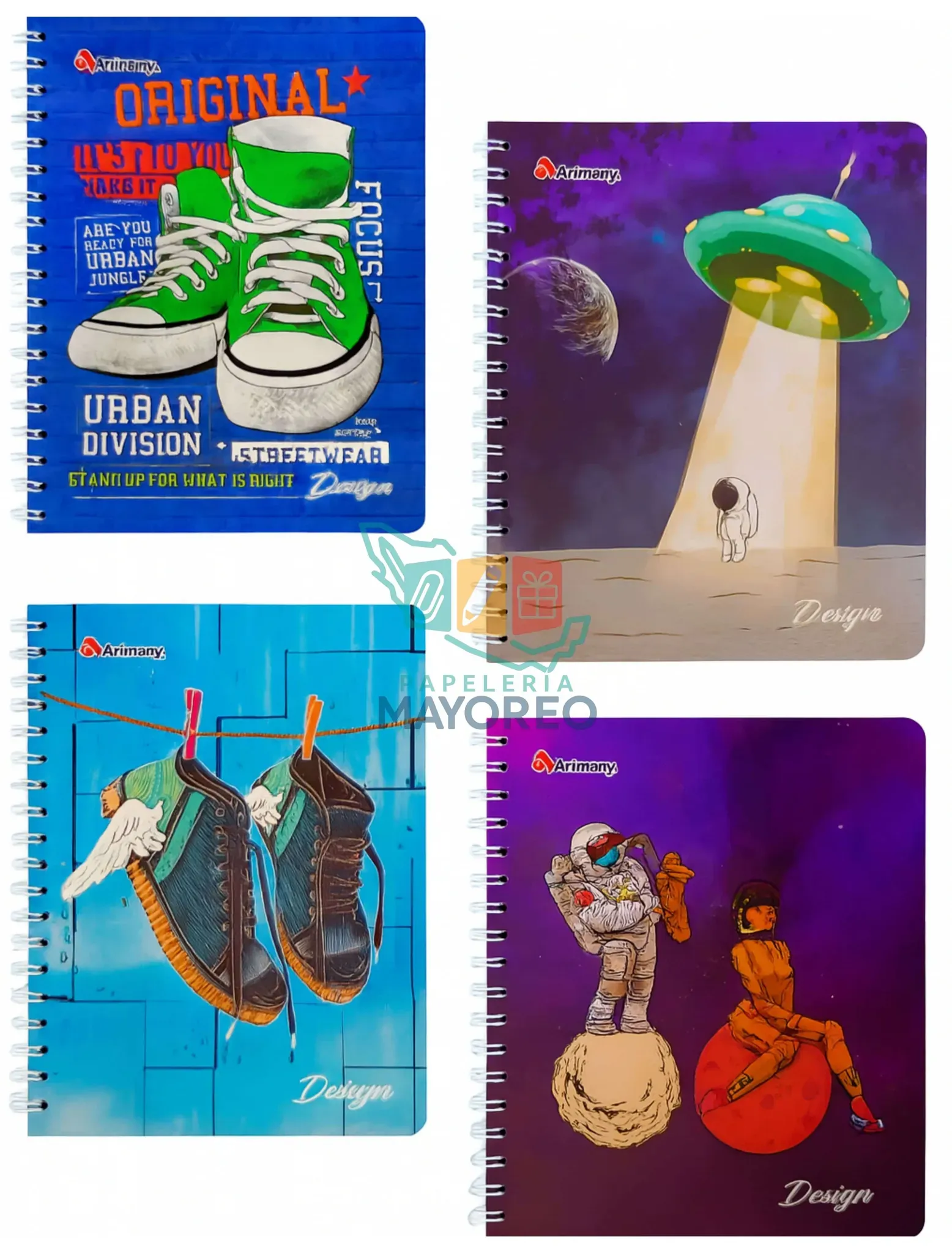 Cuadernos doble espiral Arimany con diseños originales y llamativos. Cada cuaderno cuenta con portada de cartón de alta calidad, interior de cuadro 7 o cuadro tradicional tamaño profesional , ideal para uso escolar o de oficina