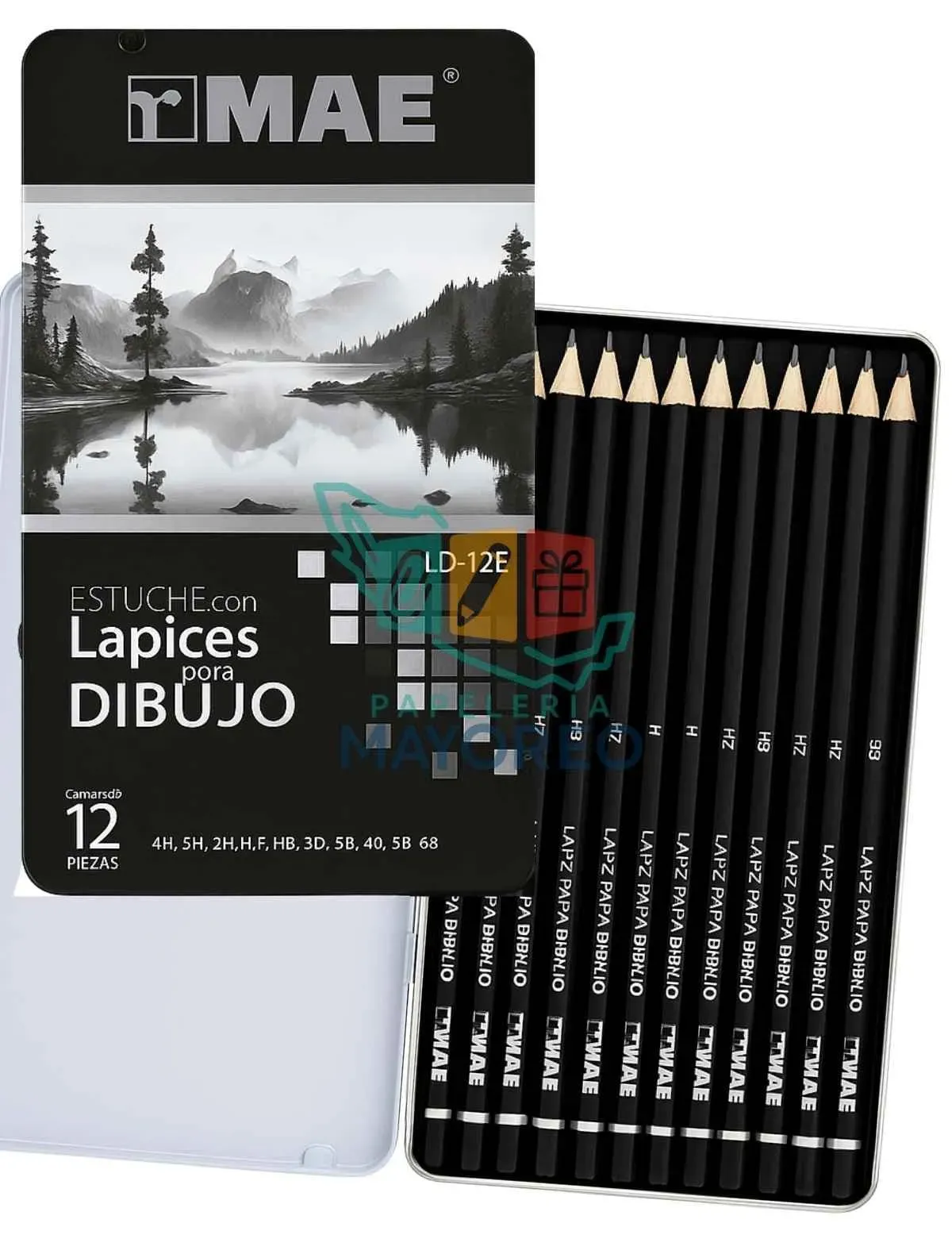stuche con 12 lápices MAE LD-12E con durezas desde 4H hasta 7B. Perfectos para dibujo artístico, técnico o bocetado, con minas suaves, resistentes y fáciles de afilar.