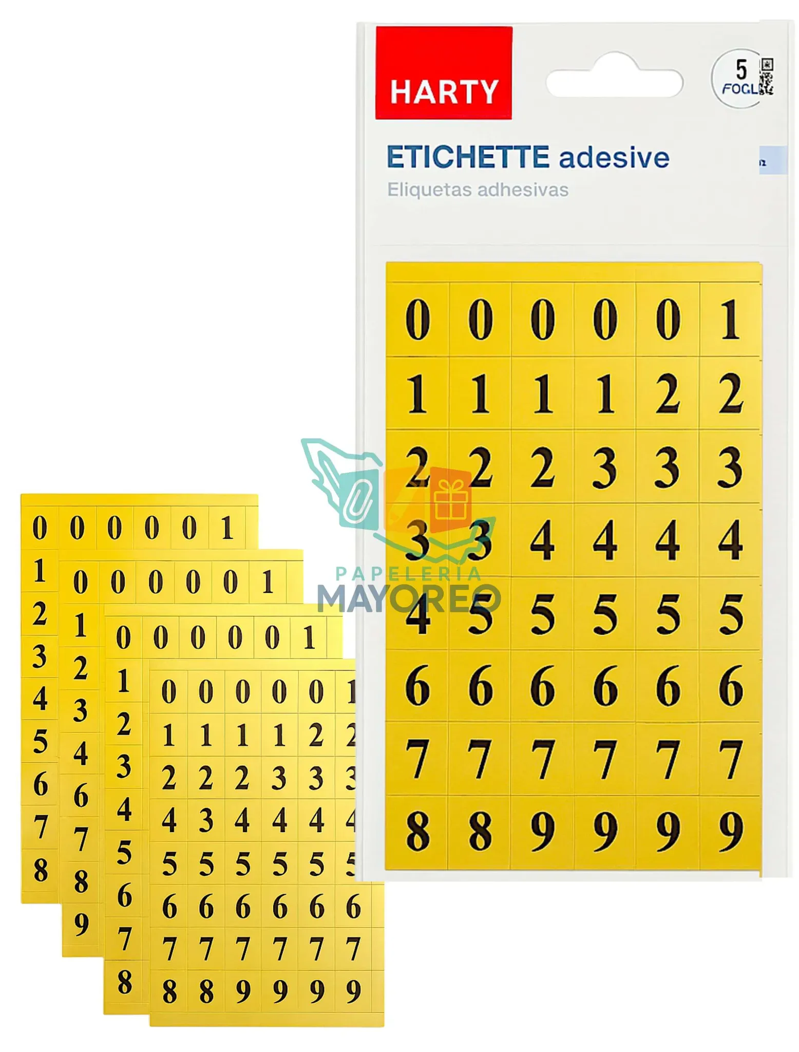 Etiquetas Adhesivas Numéricas HARTY, un paquete esencial que incluye 5 hojas de etiquetas amarillas vibrantes con números impresos en negro de alta visibilidad. Cada hoja contiene una secuencia completa de números