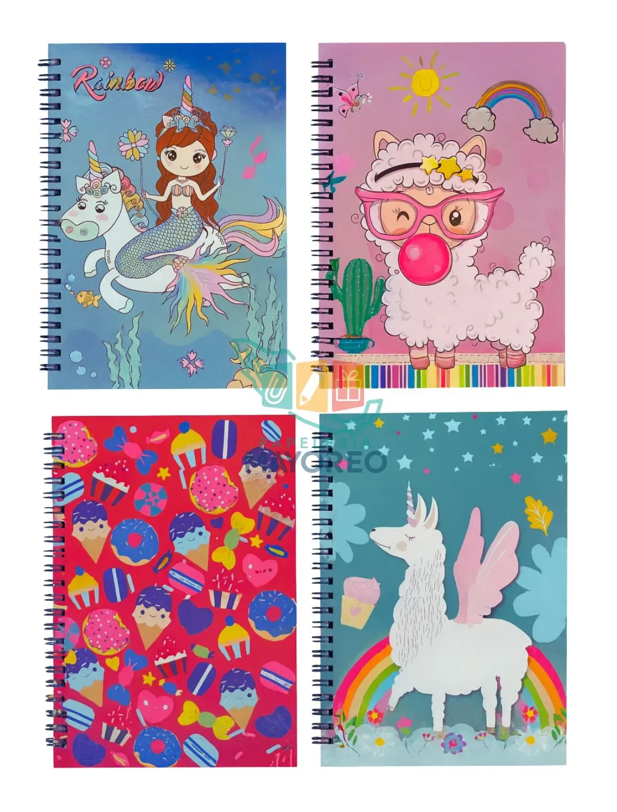 Compra al mayoreo la libreta francés raya metalizada, perfecta para uso escolar y de oficina. Modelos con diseños coloridos y originales: sirena unicornio, llama con lentes, postres y helados, y llama alada con arcoíris, encuadernado de espiral metálico y hojas rayadas estilo francés, ideales para e...