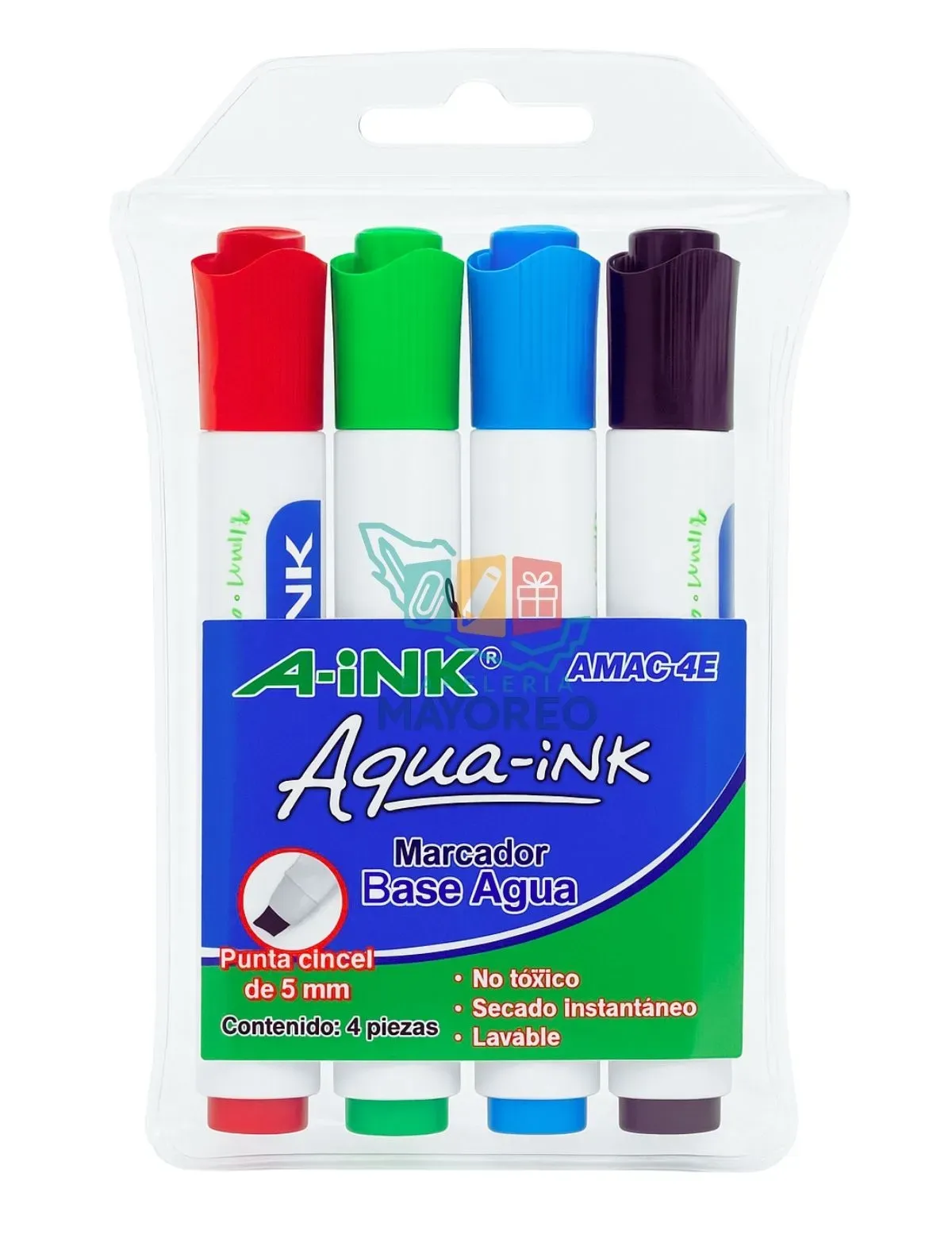 Marcadores A-INK Aqua-Ink base agua, paquete con 4 piezas, punta cincel de 5 mm.