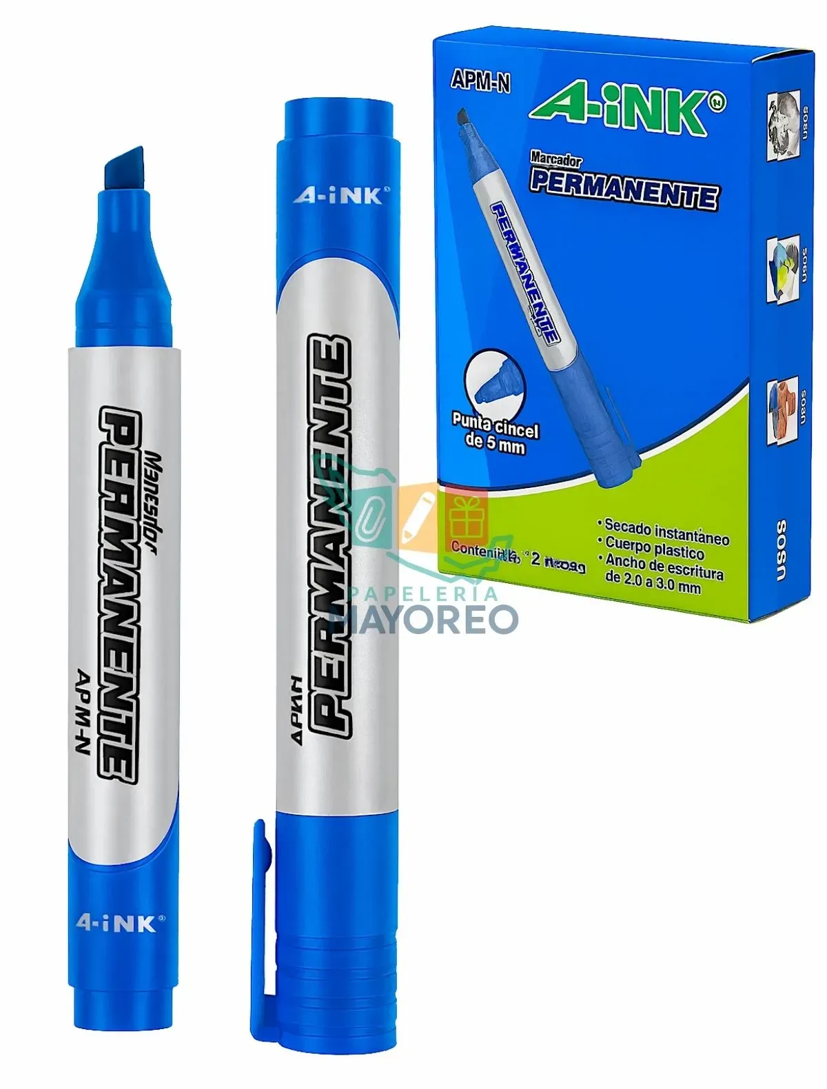 El marcador permanente A-INK APM-a es perfecto para escribir en diversas superficies como papel, cartón, plástico, vidrio, metal y más. Su punta cincel de 5 mm permite trazos finos o gruesos según la inclinación, y su tinta de secado rápido garantiza resultados duraderos y sin manchas.
