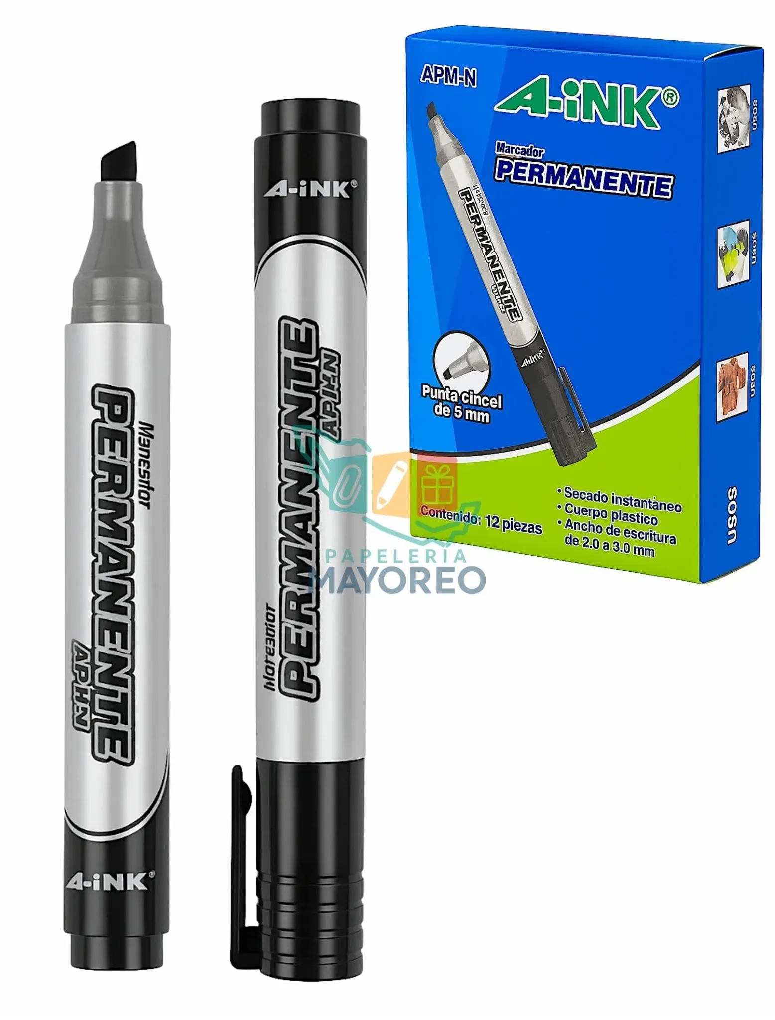 El marcador permanente A-INK APM-N es perfecto para escribir en diversas superficies como papel, cartón, plástico, vidrio, metal y más. Su punta cincel de 5 mm permite trazos finos o gruesos según la inclinación, y su tinta de secado rápido garantiza resultados duraderos y sin manchas.