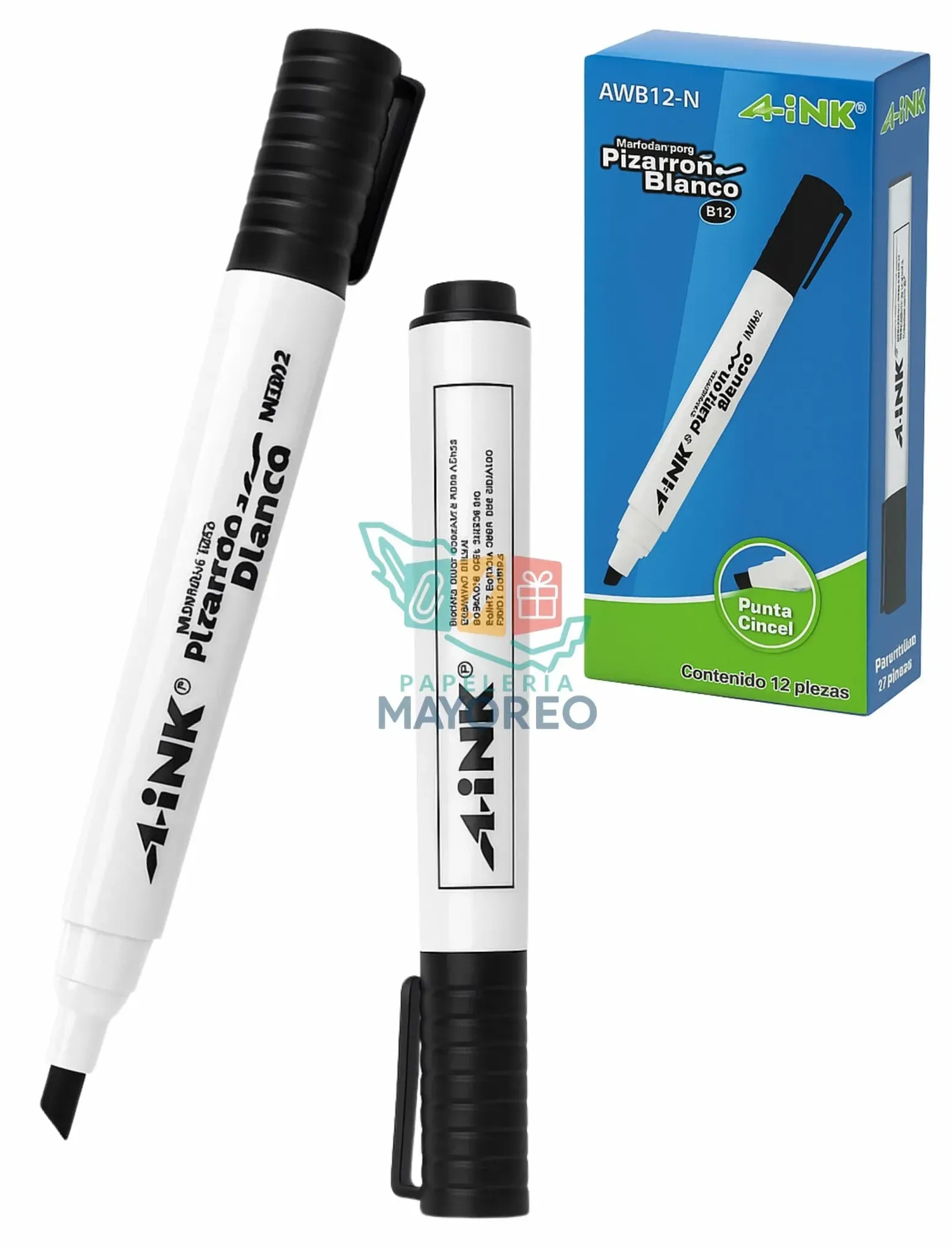 El marcador para pizarrón blanco A-INK modelo AWB12-N con tinta Negro es ideal para presentaciones, clases y oficinas. Su punta cincel permite trazos finos o gruesos con gran precisión y visibilidad. Gracias a su tinta de fácil borrado en seco, es perfecto para uso frecuente en pizarras blancas.