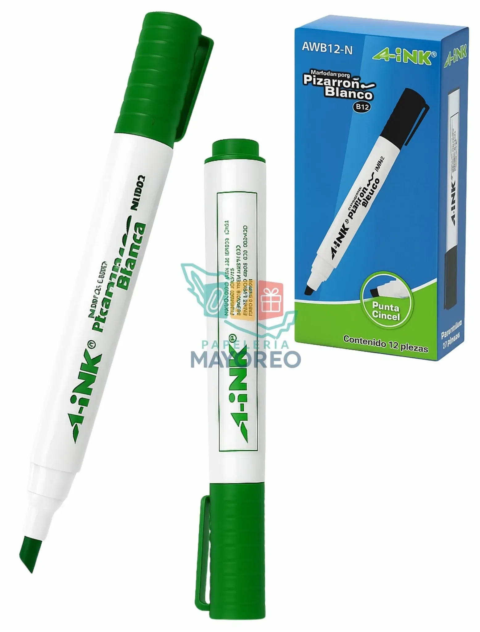 El marcador para pizarrón blanco A-INK modelo AWB12-N con tinta verde es ideal para presentaciones, clases y oficinas. Su punta cincel permite trazos finos o gruesos con gran precisión y visibilidad. Gracias a su tinta de fácil borrado en seco, es perfecto para uso frecuente en pizarras blancas.