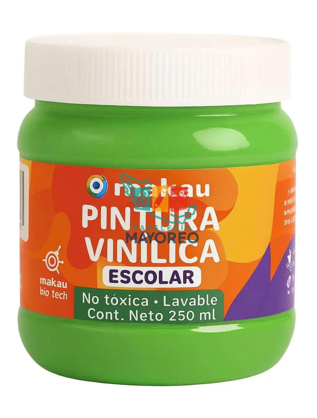 Pintura vinílica escolar color verde, ideal para manualidades y trabajos escolares. Fórmula no tóxica y lavable, segura para uso infantil.