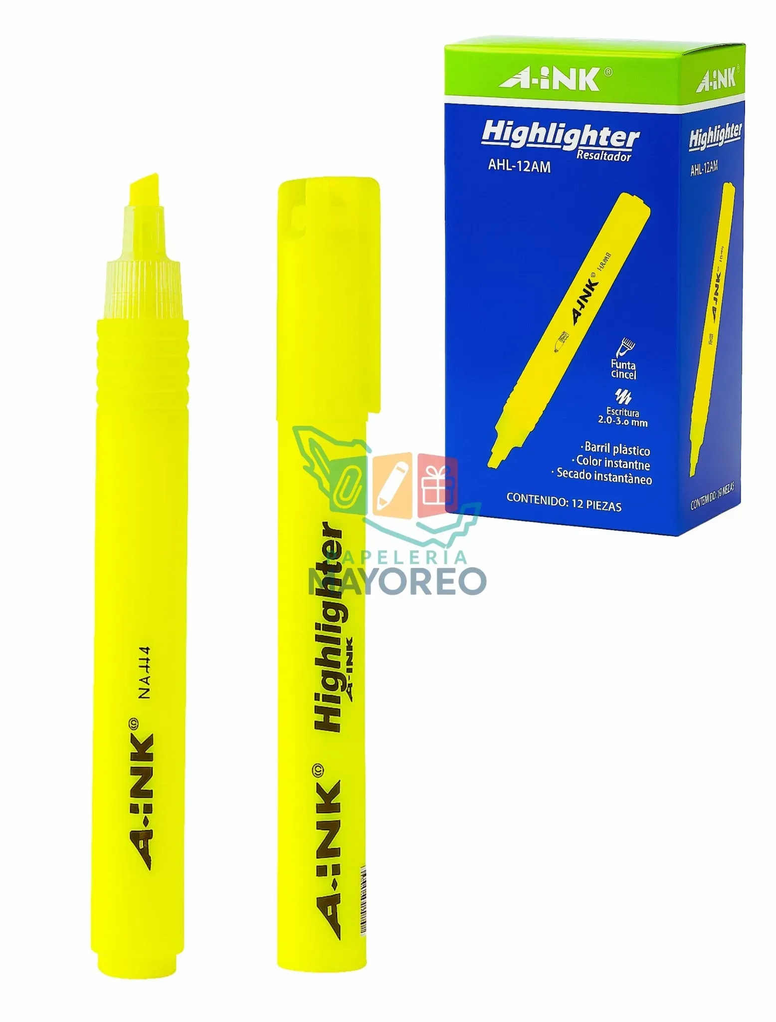 Resaltador A-INK. Su punta cincel (gruesa) permite trazos gruesos y finos , ideal para subrayar texto, en oficina o escuela. Presentado en una caja con 12 piezas.