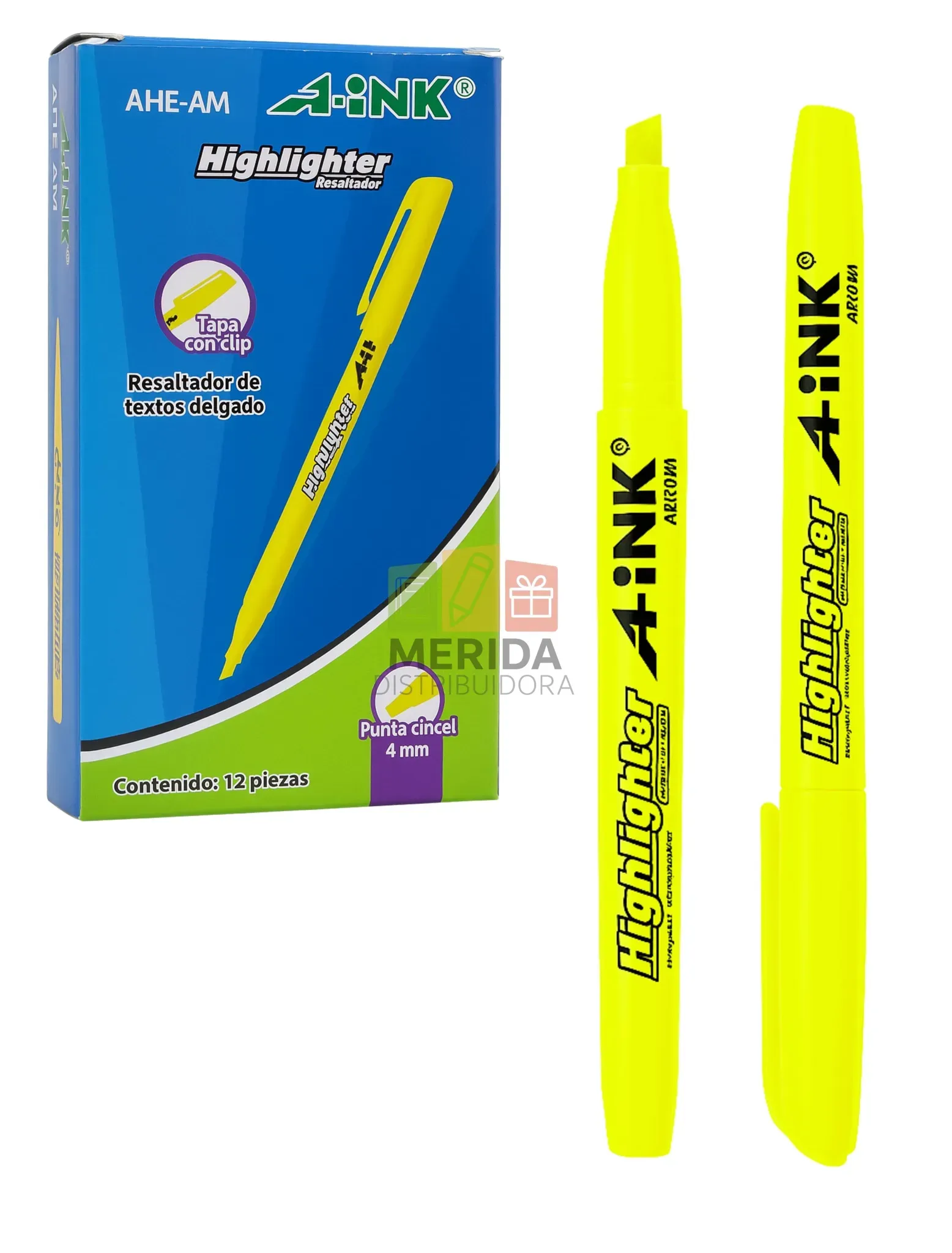 Resaltador A-INK. Su punta cincel (delgada) permite trazos semigruesoas y finos , ideal para subrayar texto, en oficina o escuela. Presentado en una caja con 12 piezas.