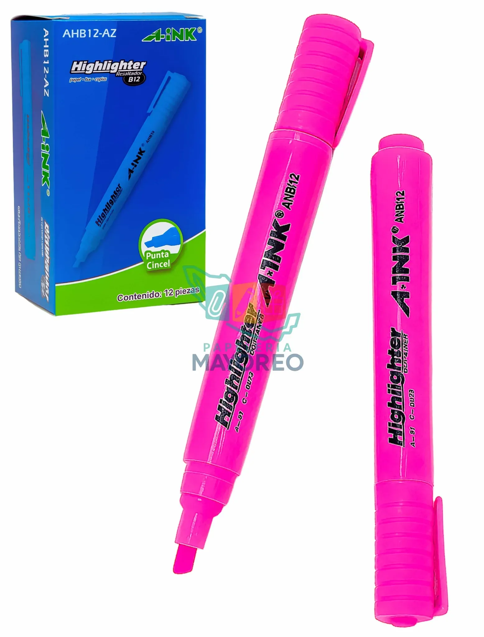Resaltador A-INK. Su punta cincel (gruesa) permite trazos gruesos y finos , ideal para subrayar texto, en oficina o escuela. Presentado en una caja con 12 piezas.