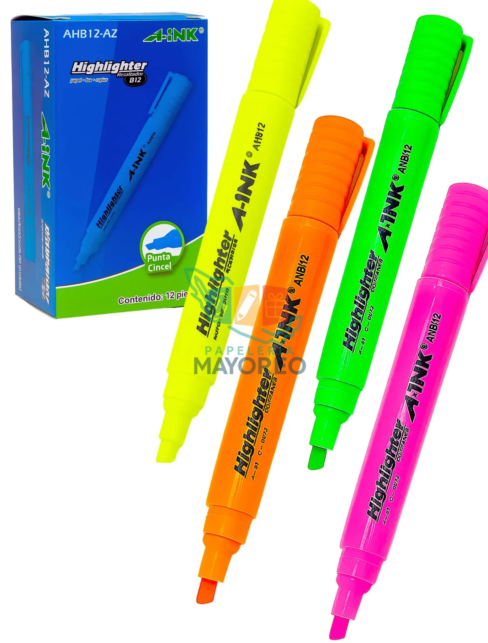 Resaltador A-INK. Su punta cincel (gruesa) permite trazos gruesos y finos , ideal para subrayar texto, en oficina o escuela. Presentado en una caja con 12 piezas.