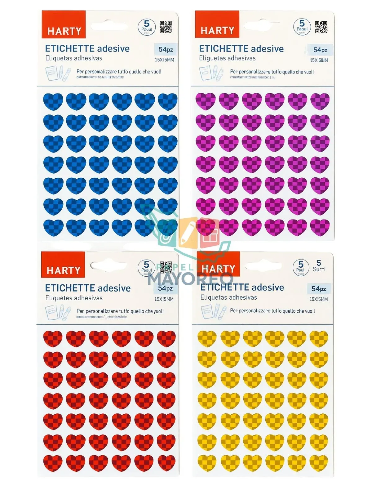 Decora, organiza y personaliza con los Stickers Surtido Paq. con 6 piezas Corazones Harty. Cada hoja incluye 54 corazones adhesivos en colores brillantes: azul, morado, rojo, amarillo, plata y rosa...