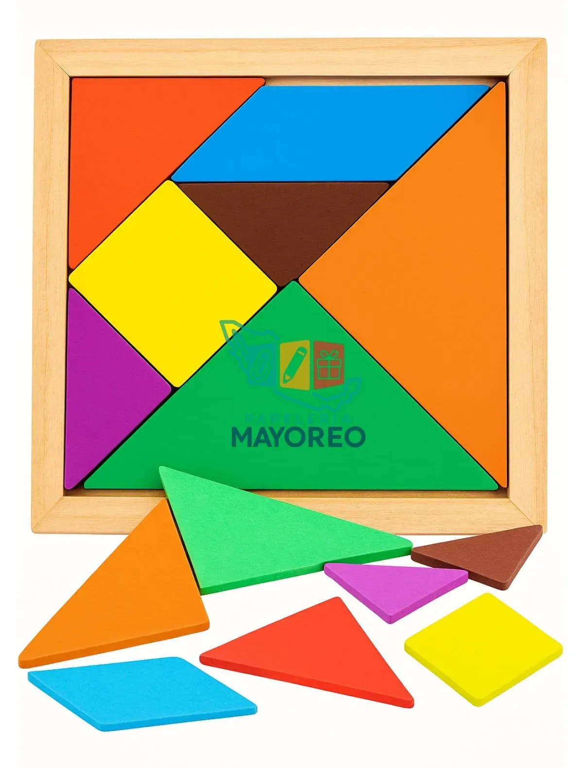 Tangram de madera con 7 piezas geométricas de colores. Ideal para desarrollar habilidades cognitivas, motricidad y creatividad en niños.